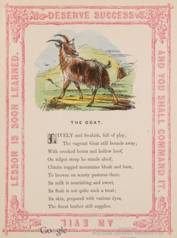 The Delphic oracle recommended Demokrates to get some worms from a goat’s brain, and in the Medicina which the Saxons adopted, a mountain goat’s brain, drawn through a golden ring, is recommended to be given to a child sick of epilepsy before it tastes milk. A goat’s horn, laid under the head of a sleepless man, “tumeth waking into sleep,” and for the bite of a snake the sufferer is told to shave off shavings of a goat’s horn into three cups, and to drink, at three different times, the milk of the same goat mingled with wine. In Scotland the blood of a wild goat, with ten drops of carduus water, was given in cases of pleurisy.