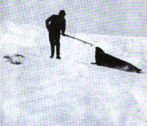 The kill was in full cry. Swiftly the men ran and leaped over rough ice. They caught seals, struck with their heavy, cruelly pointed and hooked gaffs. Cyril later boasted that he had slaughtered the first seal.