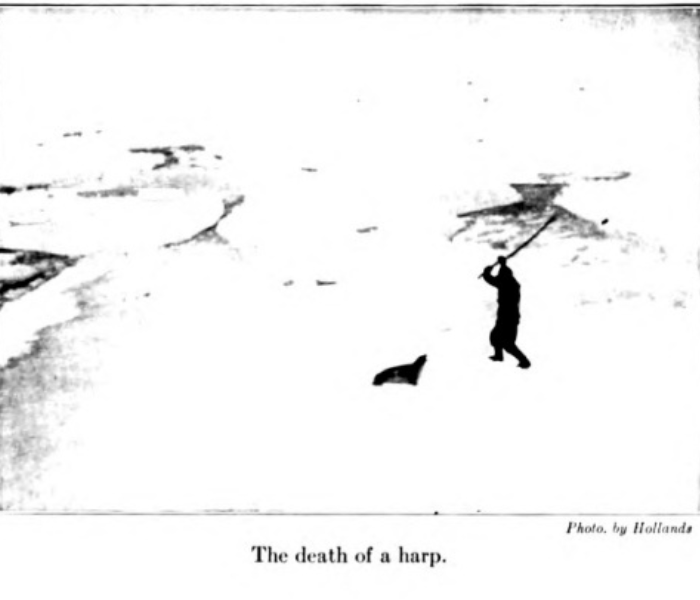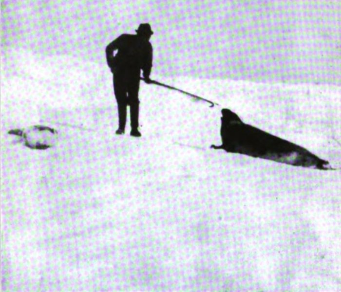 “Hayve over the seal dog! Kill y’r seal! Turn him belly up an’ putt the seal dog through his lower jaw!” Obviously there is technique in this art! Four men were required to drag in one of the pups.