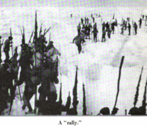 As we drew near the resting herd, boxes of ugly, soft-nosed dumdums — vicious things that would blow a seal’s head to ribbons — were tossed up from the lazarette and broken open in the runway at the top of the cabin-companion stair. The riflemen fetched out their precious guns from bunks and corners; each man with the rifle he knew and loved better perhaps than he had ever known or loved a woman. They jacked in cartridges, jostling for ammunition as Billy Richards, Mike Donovan, and Uncle Edgar served it out, filling their magazines. The dogs (gunners’ attendants) were meanwhile getting gaffs, belts, knives, and canvas nunch bags. In those bags, along with the cartridges, they stowed hard-bread; for who could tell what swift blizzard might cut off hunters miles from the ship? And in case of having to spend a night on ice, such bread helps out a meal of fipper cooked over a fire of gaff-stick shavings and strips of fat. The master watches also made sure they had their compasses.