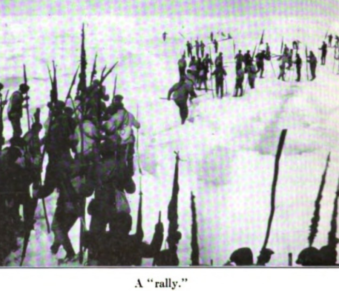 Men jostle and crowd along the rails, flecked with red snow. On the rails, blood freezes.