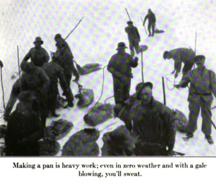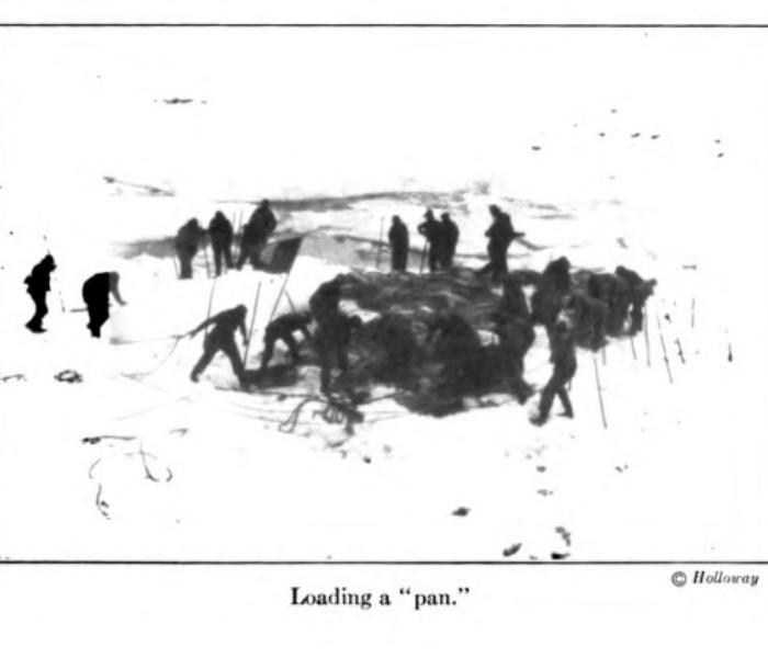 Night was filled with many labours, after the ice claw had been made fast. Big gangs fell to work, dragging in the pans of sculps and loading them. On deck at almost any time, even in the wee small hours, harsh toil always seemed going on, by raw flares of torchlights that half revealed frost-blackened faces, gleaming eyes, teeth glinting like gnomes’.