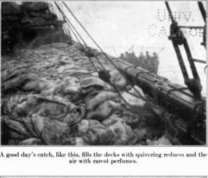 Another mass of wealth slumped and slid upon the mounds already sloping to the rail. Fearful welters of water, ice, gurry, skins, and grease filled the scuppers, where men toiled feverishly to clear the way for more.