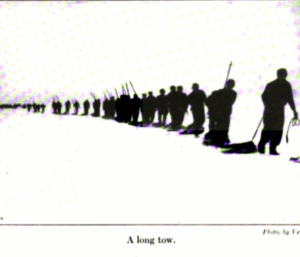 Through ice defiles and around pinnacles they toiled, each “scotin’ his tow,” bending far forward with the weight of the load. From every man’s shoulder, thus toiling, swayed and swung his gaff. Over plaques of virgin white — white no longer when they had passed! — the hunters came labouring shipward. Long, wavering lines of colour formed; they joined to broader roads, all converging on the Terra Nova. Crimson trails, these, such as no otherwhere on earth exist. Man’s mark and sign and signal in the North.