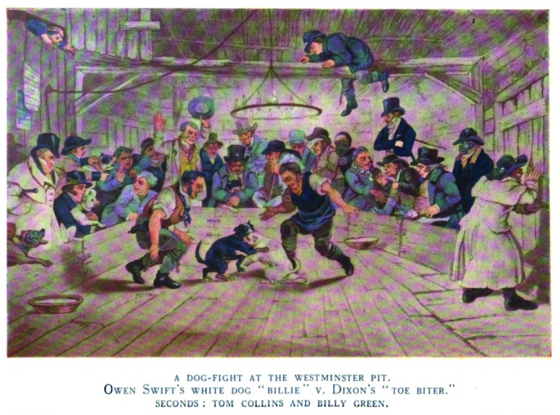By the rules of dog-fighting a dead dog can win — one dog is dead; it is the other’s turn to scratch; if he is unable or unwilling to do so, he loses. It puts a premium on gameness. This sometimes happens, and I remember a remarkable case. A new dog had been brought up from the country — in those days most of the best dogs came from the Black Country or the north — and he was matched with a London dog. He killed him in an hour, and for five hours he fought a dead dog. Think of it, fighting a dead thing for five hours! Can anything equal such determination and ferocity? At the end of that time he turned away, and his second picked him up. Of course, it was his turn to scratch; he stood swaying in his corner and could not move; the dead dog had won!