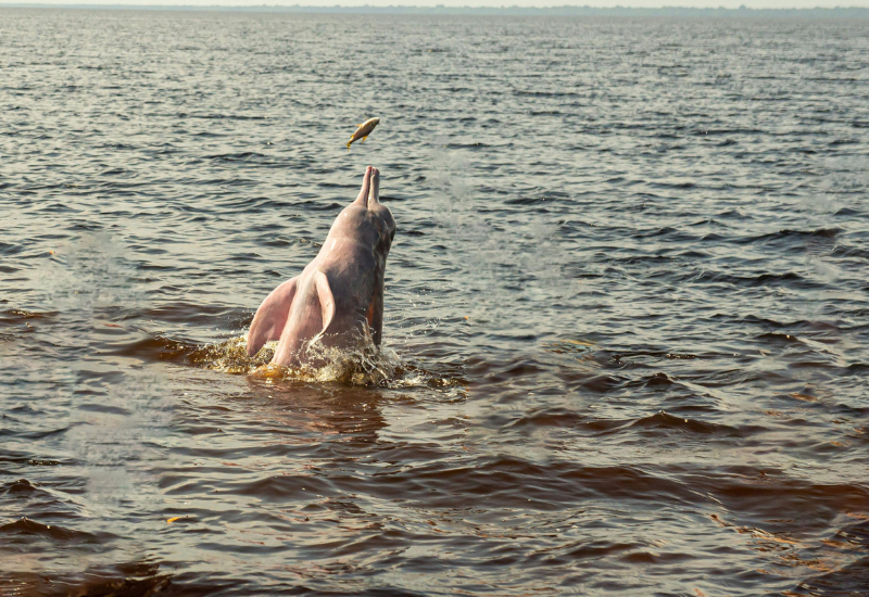 With similarly long beaks, but all of them inhabitants of fresh or brackish water, are the river-dolphins. The Brazilian species (Sotalia brasiliensis) is common in the Bay of Rio de Janeiro, and like the others of the genus is notably pale in color. The tucuxi (S. tucuxi) is an Amazon species, not clearly set off, and with it are the pale river-dolphins (S. pallida), and another closely related (S. fluviatilis). The Chinese white dolphin (S. sinensis) is milky white, shading into pink at the extremities, and with the eyes black. It is native in many Chinese rivers, and has been known since 1741 to Europeans. The Cameroon dolphin (S. teüszei) is found only in the Cameroon River, and is remarkable among all Cetaceans as feeding exclusively on vegetable matter, its teeth being blunter than those of the carnivorous members of the genus. None of the river-dolphins exceeds eight feet in length; and they are to be carefully distinguished from the fresh-water porpoises before described.