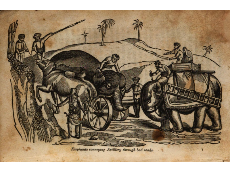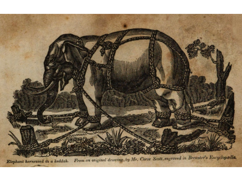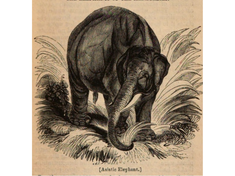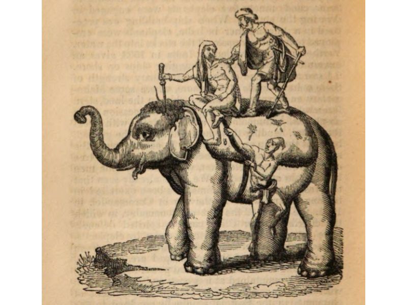 Bayard Taylor, The Elephant: Principally Viewed in Relation to Man (London: Charles Knight & Co., 1844), pp. 86-92, 94-107, 152-170, 171-172, 173-174, ans 176-179. N.B.: Footnotes have been deleted. The first two images are found on pages 9 and 146. See: https://babel.hathitrust.org/cgi/pt?id=uc1.a0006577043&seq=1. The remaining images are from pages 116, 118, 129, 158, 172, and 203. in a later edition: Charles Knight, Natural History: The Elephant as He Exists in a Wild State, and as He has been made Subservient, in Peace and in War, to the Purposes of Man (New York: Haprer, 1848).