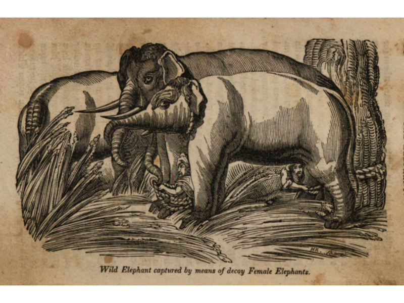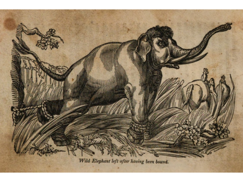 “About two-and-thirty female elephants, with their young included, were now driven into the inclosure: they were shortly followed by four male elephants, the riders of which had long ropes, with a noose at the end, in their hands. After many unsuccessful efforts, they succeeded at last in entangling the young elephant that was to be weaned, by the hind leg. This was a matter of great difficulty, for he was protected by the adroitness of the herd of female elephants which crowded round him for the purpose. When taken, he was a great deal more outrageous and obstreperous than the wild elephant caught yesterday. The large mounted elephants had to beat him frequently; and I observed, once or twice, that they raised him quite off the ground with their tusks, without doing him any material injury. The cry which he emitted on these occasions differed in no way but in degree from the squeak of a hog that is in pain or fear. He was ultimately confined in a small pen beyond one of the doors of the paddock, where two of the male elephants continued to watch him. He was still very outrageous, and making violent efforts to extricate himself, but all to little purpose.”
