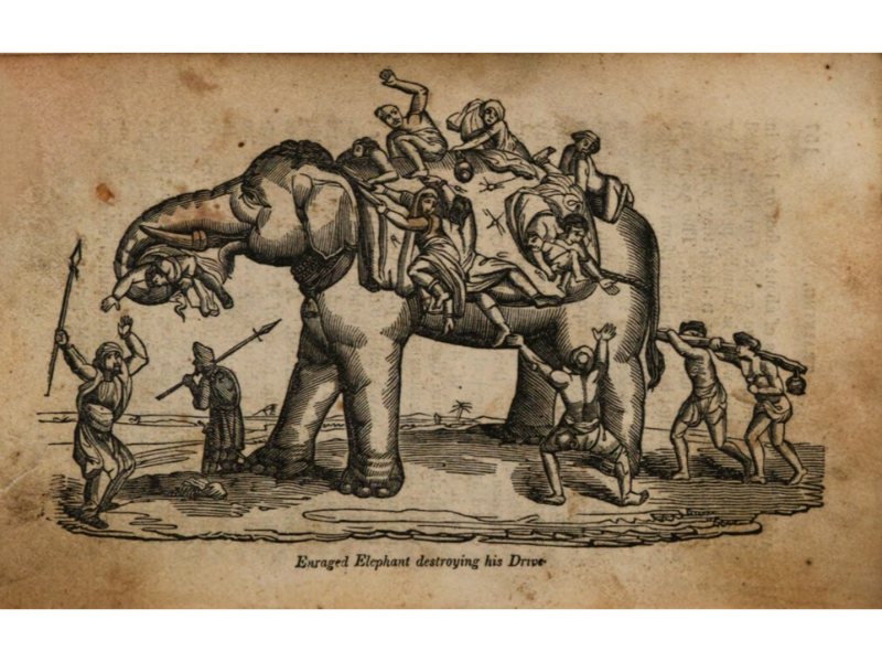 “The fight of these noble creatures is attended with much cruelty. It frequently happens that some of the riders are trodden under foot, and killed on the spot, the elephant having always cunning enough to feel the importance of dismounting the rider of his adversary, whom he therefore endeavours to strike down with his trunk. So imminent is the danger considered, that on the day of combat the unhappy men take the same formal leave of their wives and children as if condemned to death.