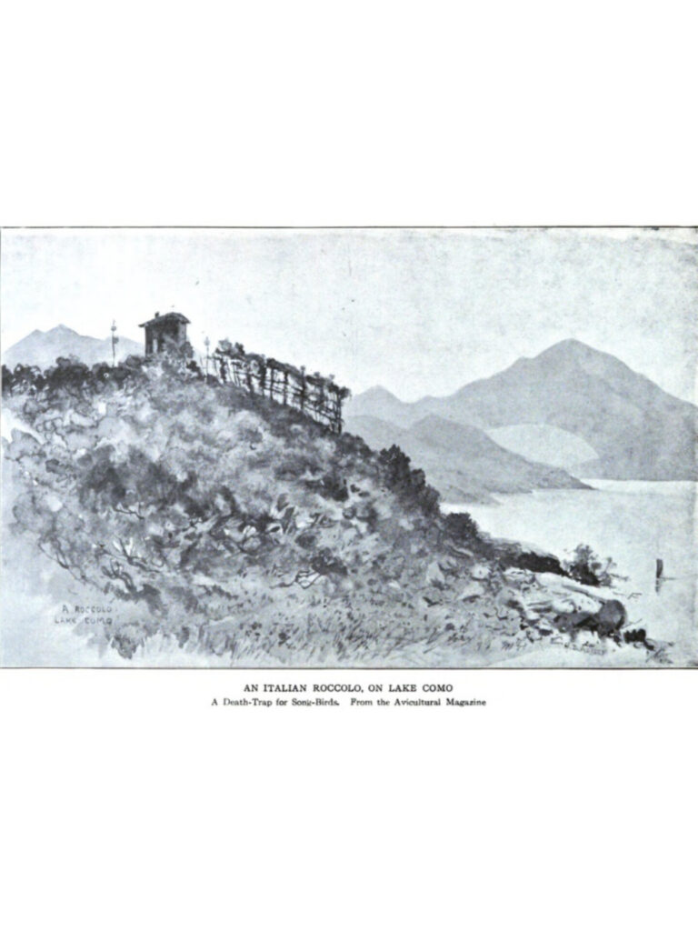 And the King of Italy, the Queen of Italy, the Parliament of Italy and His Holiness the Pope permit these things, year in and year out. It is now said, however, that through the efforts of a recently organized  bird-lovers’ society in Italy, the blinding of decoy birds for roccolos is to be stopped.