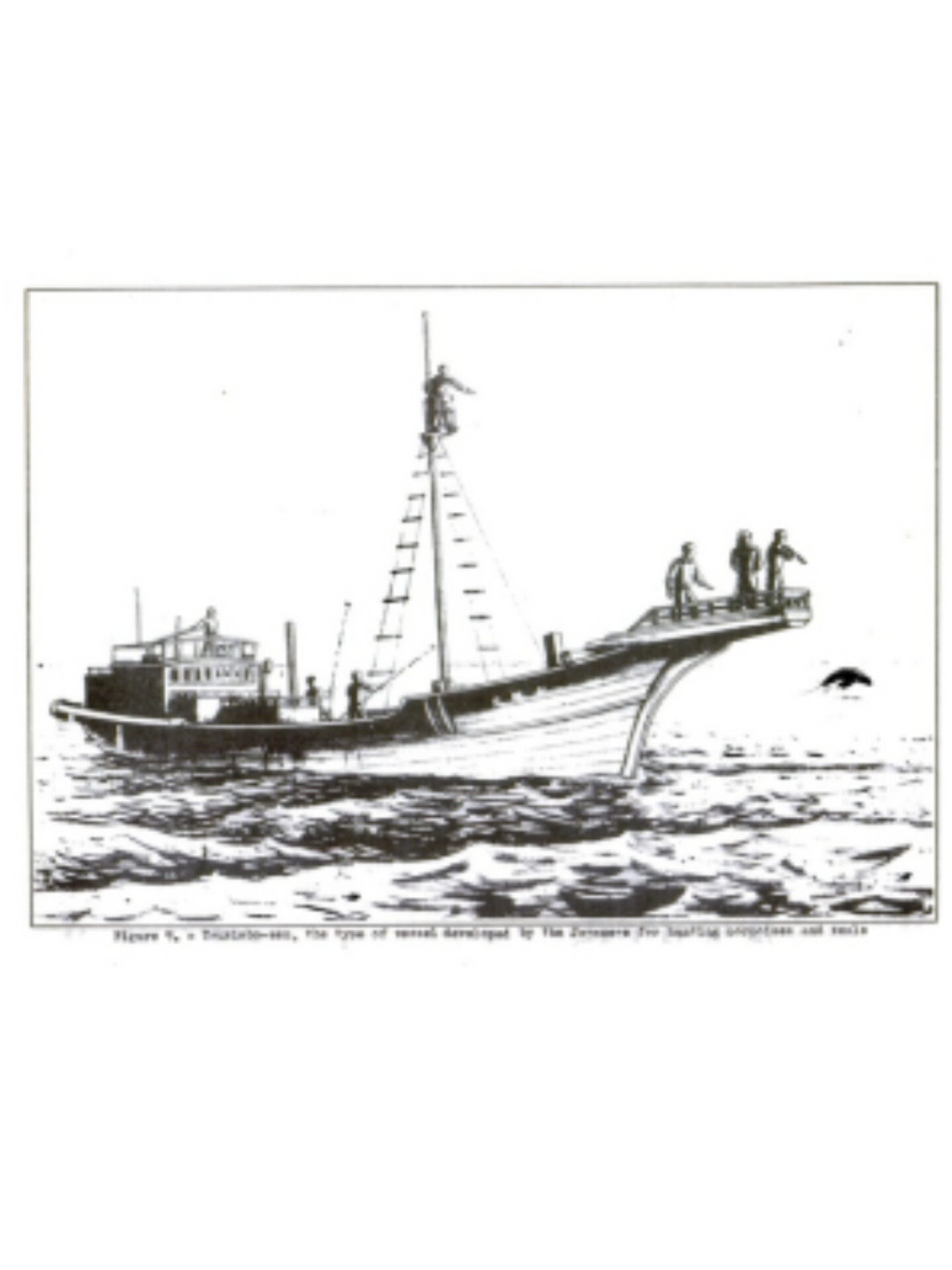 The pelagic sealing operations on which the Japanese now embarked in their coastal waters employed a radically new technique, so different from the old method and so well perfected that it does not seem likely it was developed overnight. In the old days of pelagic sealing, it will be remembered, the Japanese had religiously copied the Canadian and American techniques, whereby seals were hunted from small boats which operated from a mother ship capable of making long cruises far from the home port. The Japanese had made no essential changes in this method up to the time pelagic sealing was outlawed in 1911 and apparently used the same type of equipment in their Commander Island raids during and immediately after World War I. The new technique which so miraculously blossomed full-fledged in 1942 eliminates both the mother ship and the small hand-propelled hunting boats and substitutes for them a single vessel which is far more practical and efficient for operations in coastal waters where sealers need not remain at sea for more than two or three days at a time. The Japanese had a suitable craft ready at hand in the so-called “tsukimbo-sen” which they had developed for coastal porpoise hunting early in the 20th century….