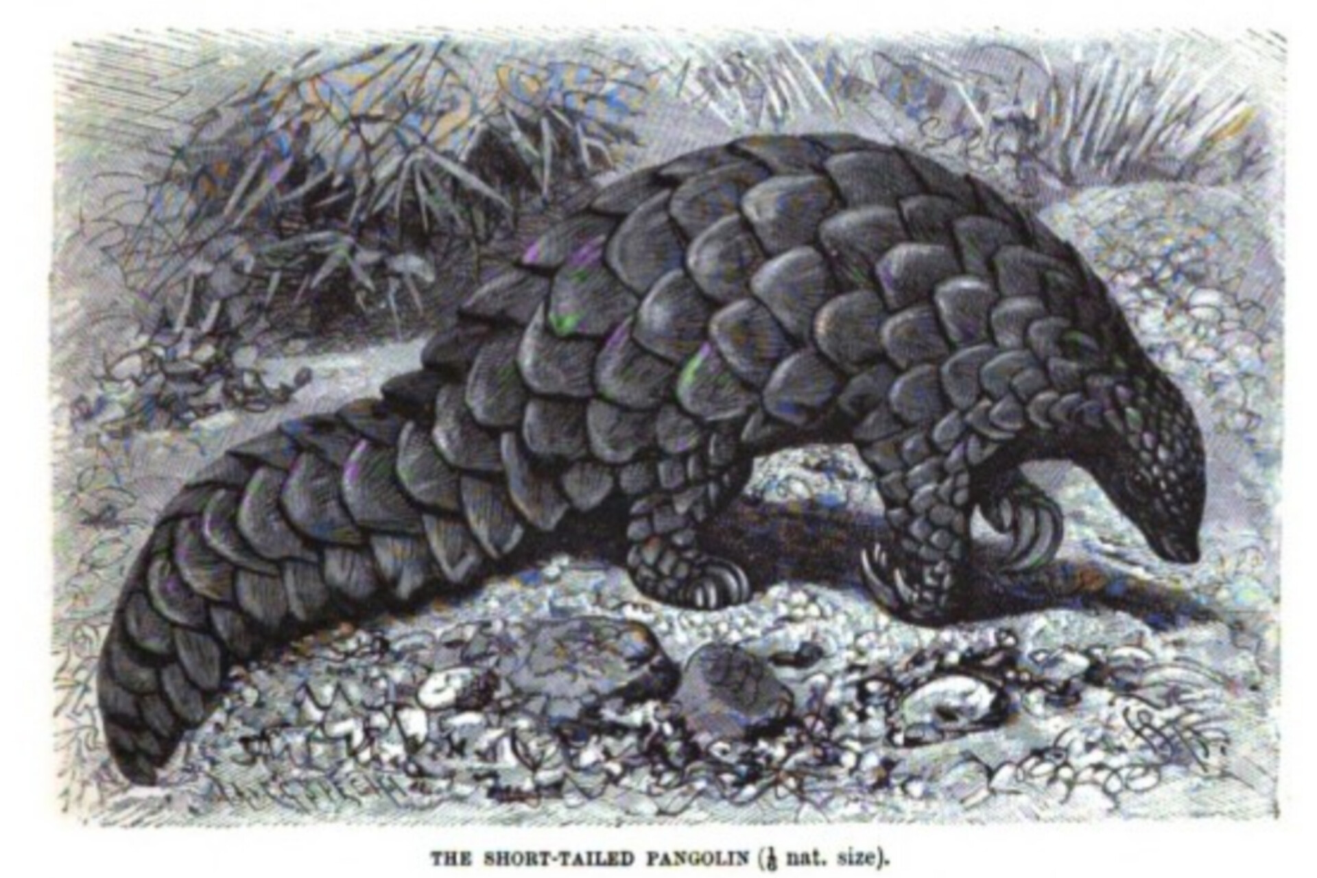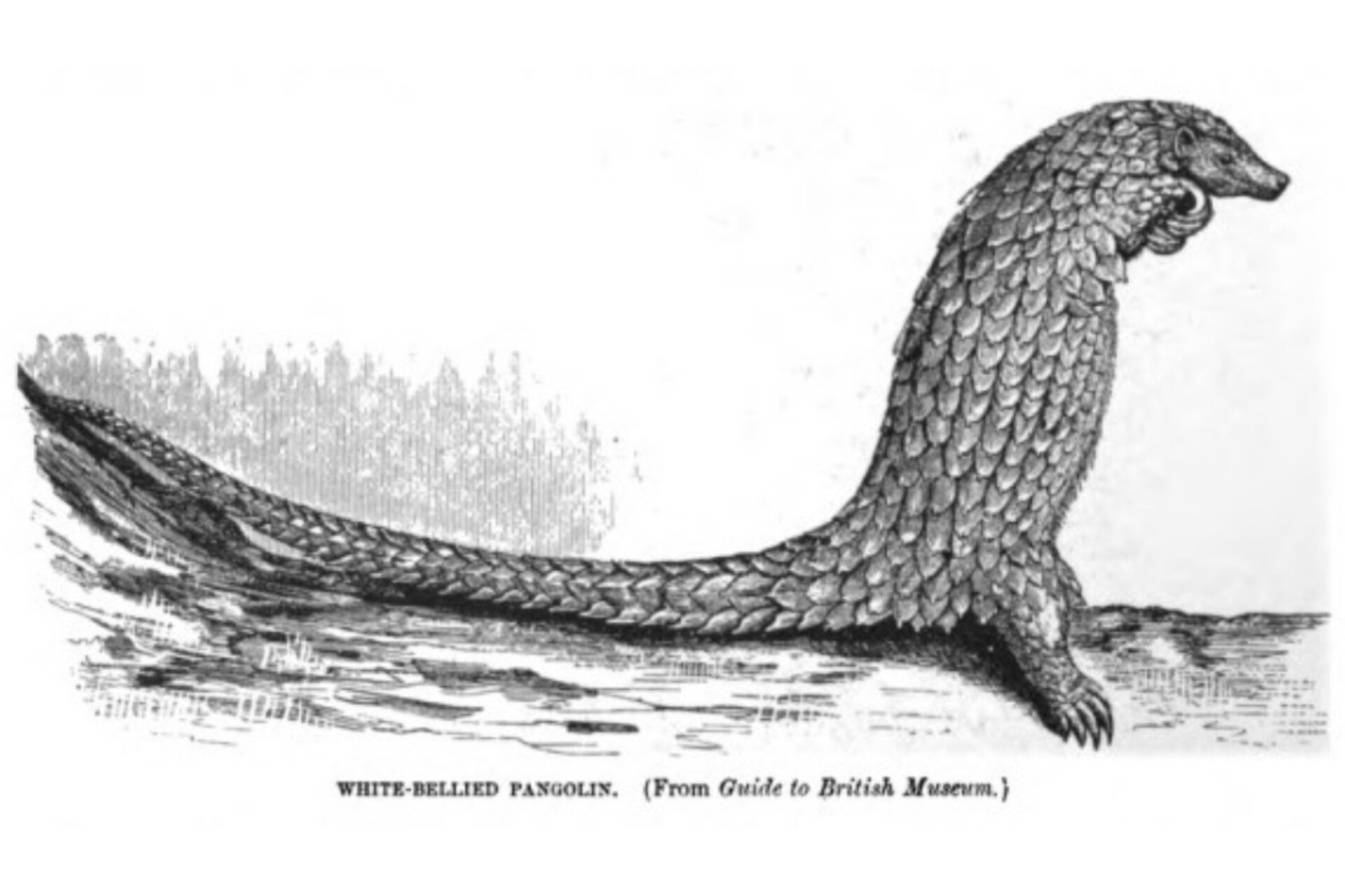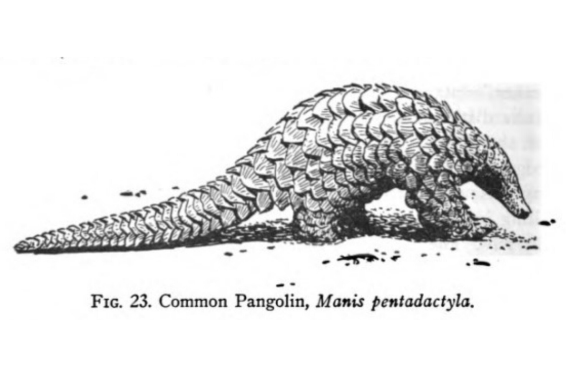 Matthew Leslie, “On the Panagolin of Bahar” in W. Jones, et al., Dissertations and Miscellaneous Pieces Relating to the History of Antiquities, the Arts, Sciences, and Literature of Asia (London: G. Nicol, 1792), pp. 288-291. Images of rolled-up and walking pangolins can be found on page 229 in Beebe, Pheasant Jungles. Fig. 23 Common Pangolin appears on page 114 in Tate, Mammals of East Asia. “An Animated Pine Cone” appears on page 226 in George Goodwin, et al., The Animal Kingdom: The Strange and Wonderful Ways of Mammals. Birds, Reptiles, Fishes, and Insects (Garden City, NY: Doubleday, 1954). The short tailed pangolin and white-bellied pangolin appear on pages 229 and 230 in Richard Lydekker, The Royal Natural History, Vol. 3 (London: F. Warne, 1893-1896).