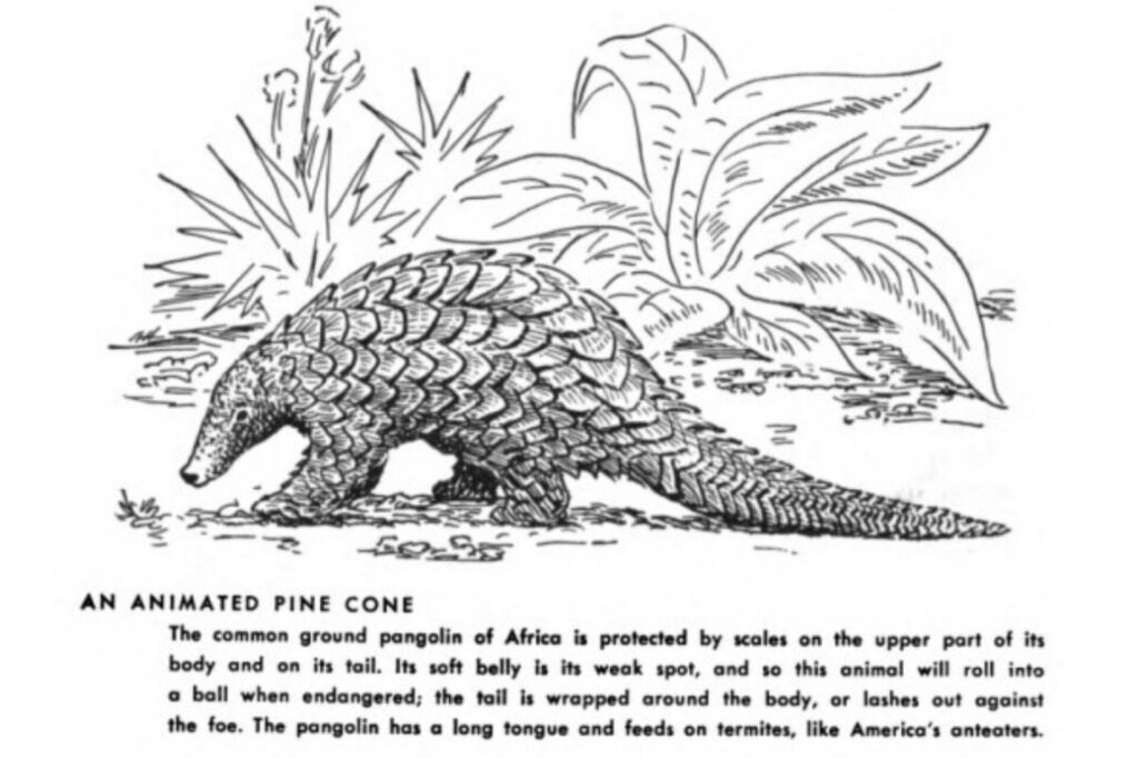 “SUPERNATURAL POWERS” OF THE PANGOLIN: With all these strange powers, it is not surprising that Africa’s natives are inclined to regard the pangolin as having supernatural attributes. The bushmen and others use its scales as charms. In South Africa the pangolin is credited by the natives with having some strange influence over their cattle. When a pangolin is captured, the poor beast is burned at the stake in the cattle pen — a sort of sacrifice to preserve the health of the cattle and improve the fertility of the herd. This practice is perhaps one of the reasons why the pangolins are becoming increasingly rare in that part of the continent.