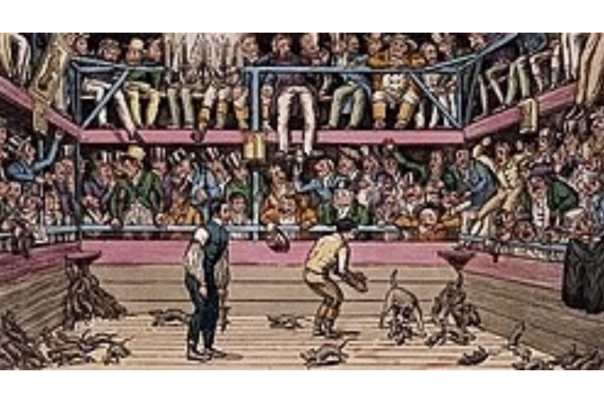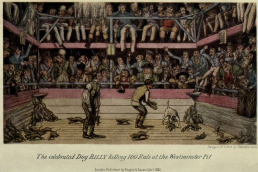 In our day there are different rules and regulations for rat-matches; for if there be one suspicious rat put into the pit, it is instantly replaced by another, so that they are all approved rats. Then, when the dog has done his work, and his master, or second, has picked him up, should there be any rats lingering, they are placed in the centre of the pit; and if they can induce them to rise and crawl the length of their bodies, the dog has to come in a second time, and finish them; and the time thus employed is added to the rest, thus does many a furious animal lose the match. And had Billy been bound by such rules as these, I am persuaded he would have been nearer twelve minutes than five in accomplishing the task.