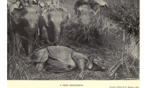 All this time my elephant, apparently paralysed with fear, had not moved, but the noise the pachyderm made was irresistible, so my “hathee” broke away from the mahout and ran off in a direction the very opposite of that taken by our antagonist, and went fully a quarter of a mile before it could be stopped. Whilst running away, I turned round and was under the impression that I saw a second rhinoceros retiring, and it must have been that one I afterwards followed, for I could not find it anywhere. An ominous noise from quite a contrary direction now struck my ear, so I hied back, and found a very large male, stone dead. It had a thick, massive horn, but only eight inches in length, weighing one and three quarter seers.