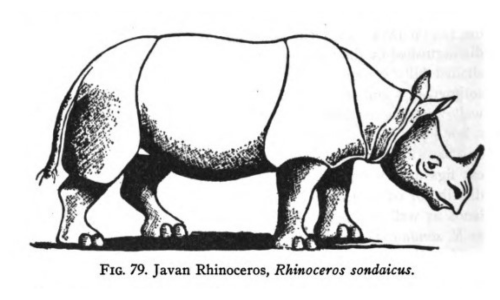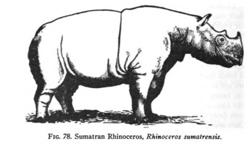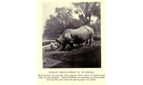 Fitz W.T. Pollok and W.S. Thom, Wild Sports of Burma and Assam (London: Hurst & Bennet, Ltd., 1900), pp. 82-87. “A Dead Rhinoceros” appears on page 83 in this book. The two drawings are found in Tate, Mammals of East Asia on pages 352 and 354. The black and white photo of an “Indian Rhinoceros in Mudhole” appears on page 130 in Graham Renshaw, Natural History Essays (London: Sherratt & Hughes, 1904). The additional photos can be found in: https://en.wikipedia.org/wiki/Sumatran_rhinoceros and https://en.wikipedia.org/wiki/Indian_rhinoceros