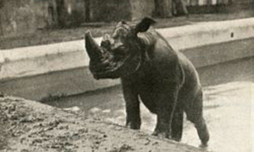 Fables have it that the Rhinoceros is the deadly enemy of the Elephant. In The Arabian Nights, the Rhinoceros, after stabbing its horn into the underparts of the elephant, carried that animal about on its head until blinded by the juices running down from the elephant’s body.