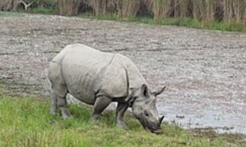 We were going along, on another occasion, about a quarter of a mile from the Manass. Matagoorie, our destination, was in sight. About forty yards ahead of me was a huge rhinoceros, standing behind a very large tree. Its head and neck were invisible, but the shoulder was just exposed, and a shot from one of my two groove rifles knocked it down and it lay struggling on the ground. I fired three more barrels into it, but it got up and very slowly, went away only presenting to me its enormous stern. I told the mahout to urge his beast on, but no punishment would induce it to accelerate its pace by one inch. There I was, fifty yards behind, dense forest a hundred yards ahead, and not a prospect of our heading the brute before it got into its stronghold, where I could not follow!