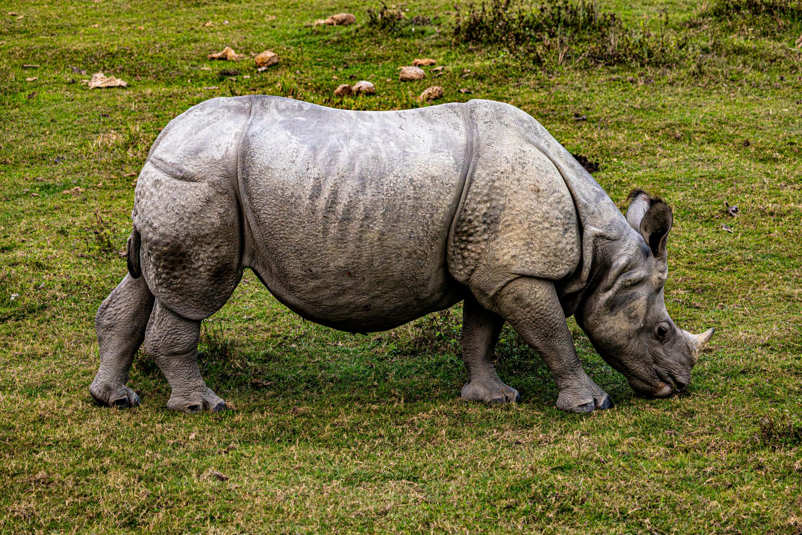 The Greater One-horned Rhinoceros, Rhinoceros unicornis, rapidly becoming extinct, enters our area only at the eastern end of its range near the southern foot of the Himalayas and eastward into Assam. Formerly it occurred over much of peninsular India. The skin of the sides is covered with rivet-like flattish tubercles, particularly on the fore and hind quarters. The heavy skin fold in front of the shoulder does not extend over the neck to meet the one on the other side, as in R. sondaicus. The horn is sharply conical and often about 6 inches high. Unusually large horns measuring 24 inches around the curve have been recorded.