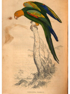 “On arriving at Mr Dunbar’s, below Natchez, I procured a cage, and placed it under the piazza, where, by its call, it soon attracted the passing flocks; such is the attachment they have for each other. Numerous parties frequently alighted on the trees immediately above, keeping up a constant conversation with the prisoner. One of these I wounded slightly in the wing, and the pleasure Poll expressed on meeting with this new companion was really amusing. crept close up to it as it hung on the side of the cage, chattering to it in a low tone of voice, as if sympathizing in its misfortune, scratched about its head and neck with her bill; and both at night nestled as close as possible to each other, sometimes Poll’s head being thrust among the plumage of the other. On the death of this companion, she appeared restless and inconsolable for several days.