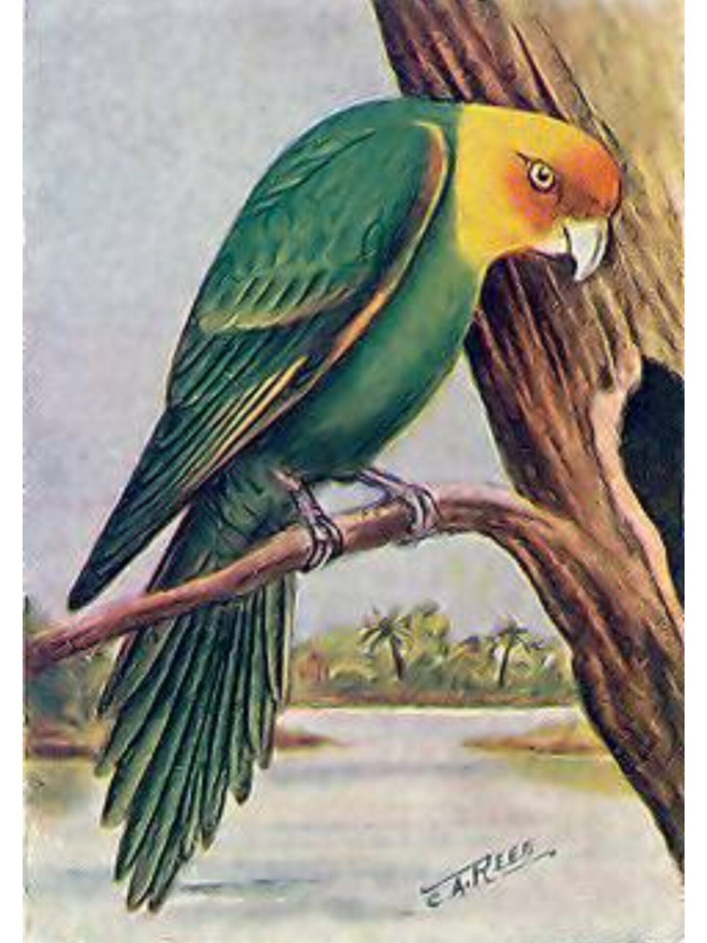 “In descending the river Ohio, by myself, in the month of February, I met with the first flock of Parrakeets, at the mouth of the Little Sioto. I had been informed, by an old and respectable inhabitant of Marietta, that they were sometimes, though rarely, seen there. I observed flocks of them, afterwards, at the mouth of the Great and Little Miami, and in the neighbourhood of numerous creeks that discharge themselves into the Ohio. At Big Bone lick, thirty miles above the mouth of Kentucky river, I saw them in great numbers. They came screaming through the woods in the morning, about an hour after sunrise, to drink the salt water, of which they, as well as the Pigeons, are remarkably fond. When they alighted on the ground, it appeared at a distance as if covered with a carpet of the richest green, orange, and yellow: they afterwards settled, in one body, on a neighbouring tree, which stood detached from any other, covering almost every twig of it, and the sun, shining strongly on their gay and glossy plumage, produced a very beautiful and splendid appearance. Here I had an opportunity of observing some very particular traits of their character: having shot down a number, some of which were only wounded, the whole flock swept repeatedly around their prostrate companions, and again settled on a low tree, within twenty yards of the spot where I stood. At each successive discharge, though showers of them fell, yet the affection of the survivors seemed rather to increase; for, after a few circuits around the place, they again alighted near me, looking down on their slaughtered companions with such manifest symptoms of sympathy and concern, as entirely disarmed me. I could not but take notice of the remarkable contrast between their elegant manner of flight, and their lame crawling gait among the branches. They fly very much like the Wild Pigeon, in close compact bodies, and with great rapidity, making a loud and outrageous screaming, not unlike that of the Red-headed Woodpecker. Their flight is sometimes in a direct line; but most usually circuitous making a great variety of elegant and easy serpentine meanders, as if for pleasure.”