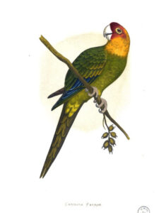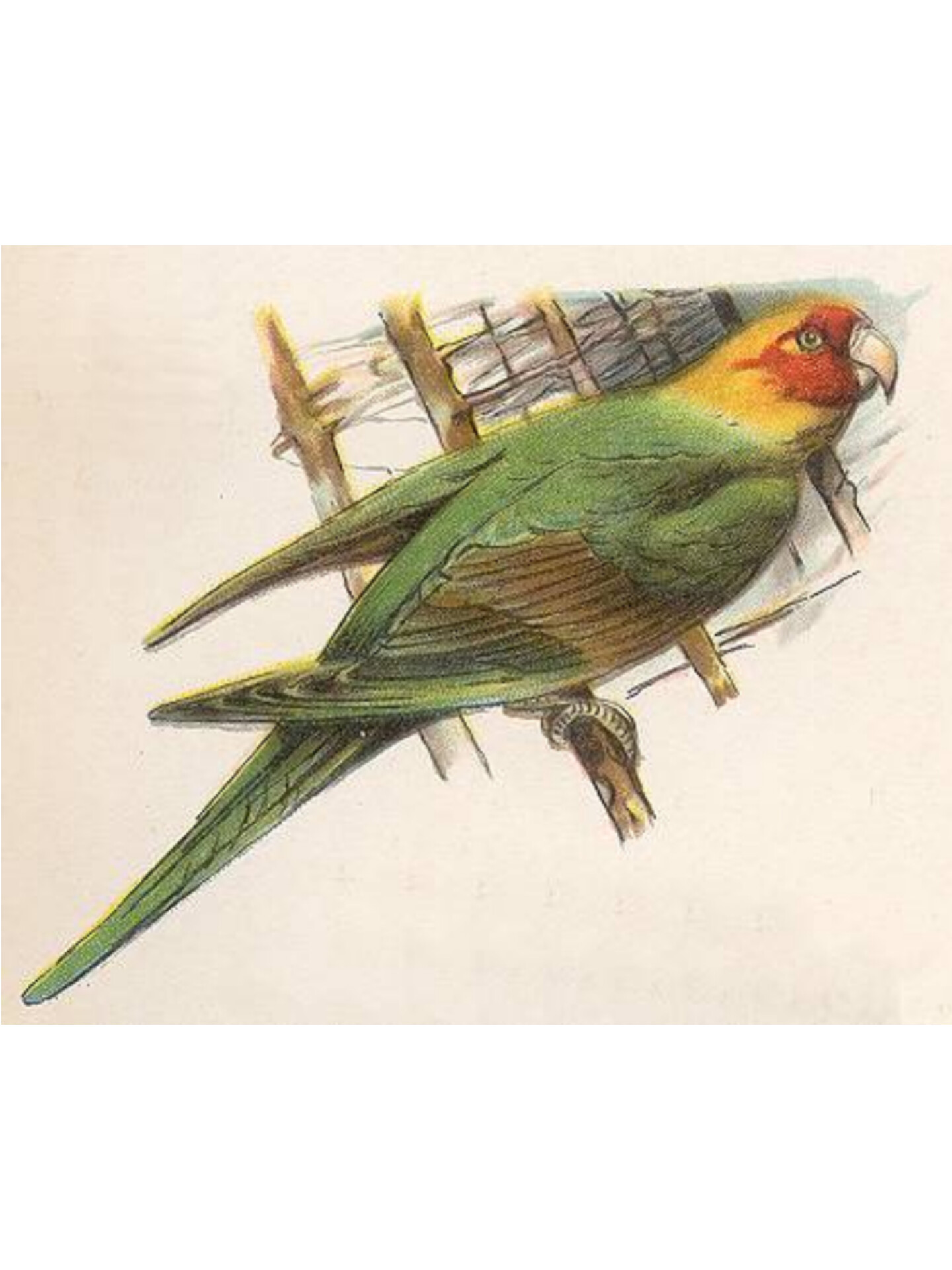 Psittacus Carolinensis, Russ. SYNONYMS: Conurus Carolinensis, GR., Lss., etc.; Psittacus luteocapillus, VLL.; Psittacus ludovicianus, Va.; Aratinga ludoviciana, STPH.; Sittace ludoviciana, WGL.; Centurus Carolinensis, ADB.; Arara Carolinensis, SLB. et JRD. GERMAN: Der Karolina-Sittich. FRENCH: Perruche à tête aurore, BUFFON.