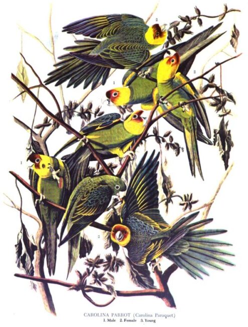 “Of one hundred and sixty-eight kinds of Parrots, enumerated by European writers as inhabiting the various regions of the globe, this is the only species found native within the territory of the United States. The vast and luxuriant tracts lying within the torrid zone, seem to be the favourite residence of those noisy, numerous, and richly plumaged tribes. The Count de Buffon has, indeed, circumscribed the whole genus of Parrots to a space not extending more than twenty-three degrees on each side of the equator: but later discoveries have shewn this statement to be incorrect, as these birds have been found on our continent as far south as the Straits of Magellan, and even on the remote shores of Van Diemen’s Land, in Terra Australasia. The species now under consideration is also known to inhabit the interior of Louisiana, and the shores of Mississippi and Ohio, and their tributary waters, even beyond the Illinois river, to the neighbourhood of Lake Michigan, in lat. 42 deg. north; and, contrary to the generally received opinion, is chiefly resident in all these places. Eastward, however, of the great range of the Alleghany, it is seldom seen farther north than the state of Maryland; though straggling parties have been occasionally observed among the valleys of the Juniata; and, according to some, even twenty-five miles to the north-west of Albany, in the state of New York. But such accidental visits furnish no certain criteria by which to judge of their usual extent of range; those aërial voyagers, as well as others who navigate the deep, being subject to be cast away, by the violence of the elements, on distant shores and unknown countries.