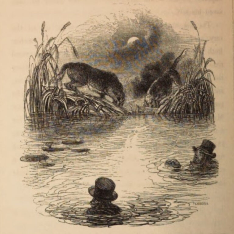 Their situation was dreadful. The sweat burst from the brow of each in large and fearful drops, — their knees were inclined to refuse their office, — their breath was thick and quick, and their hearts beat with terror. But, although the occasion was trying, each one held off despair at full arm’s length. The cry of the hounds was deeper and nearer. “They are coming, — follow me!” said the wily and desperate keeper. He walked cautiously into the water at a known point, closely followed by the poacher, who, amid all his numerous adventures, had never encountered anything like this. The keeper waded until the water reached his neck; and there he stood as mute as a fish. His companion, being of shorter stature, could not advance so far, and therefore was obliged to keep nearer the bank. The ripple that found its way to the shore was never curled with a more fearful import. Either would have sacrificed the other to have saved himself.