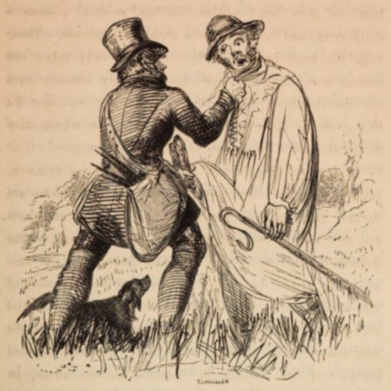During the poacher’s leisure hours on a Sunday (for he seldom visits either church or chapel), he may be seen loitering on the roads in the neighbourhood of some well-stored preserve. He observes at feeding-time, about sunset, where the game is most abundant, and forms his plans accordingly; knowing full well that he has the best chance of success where game is the most plentiful. He uses the net, the snare, and the air-gun — and frequently the common fowling-piece, which, being made to unscrew, he can secrete in his capacious pockets; and he often derives much assistance from a well-trained lurcher, which hunts mute. The snare is set by stealth, not only in the hedgerows, but in the fields and in the woods, where the run is visible. His greatest danger is in taking them up; but his sense of hearing is remarkably acute; he can mark the slightest footfall, and is never alarmed with the rustle of the beech leaf, or the deep moan of the Scotch fir. He has all the alertness of the North American Indian, and is almost as untiring on foot. If he be suddenly pounced upon, the loss of life is almost inevitable.