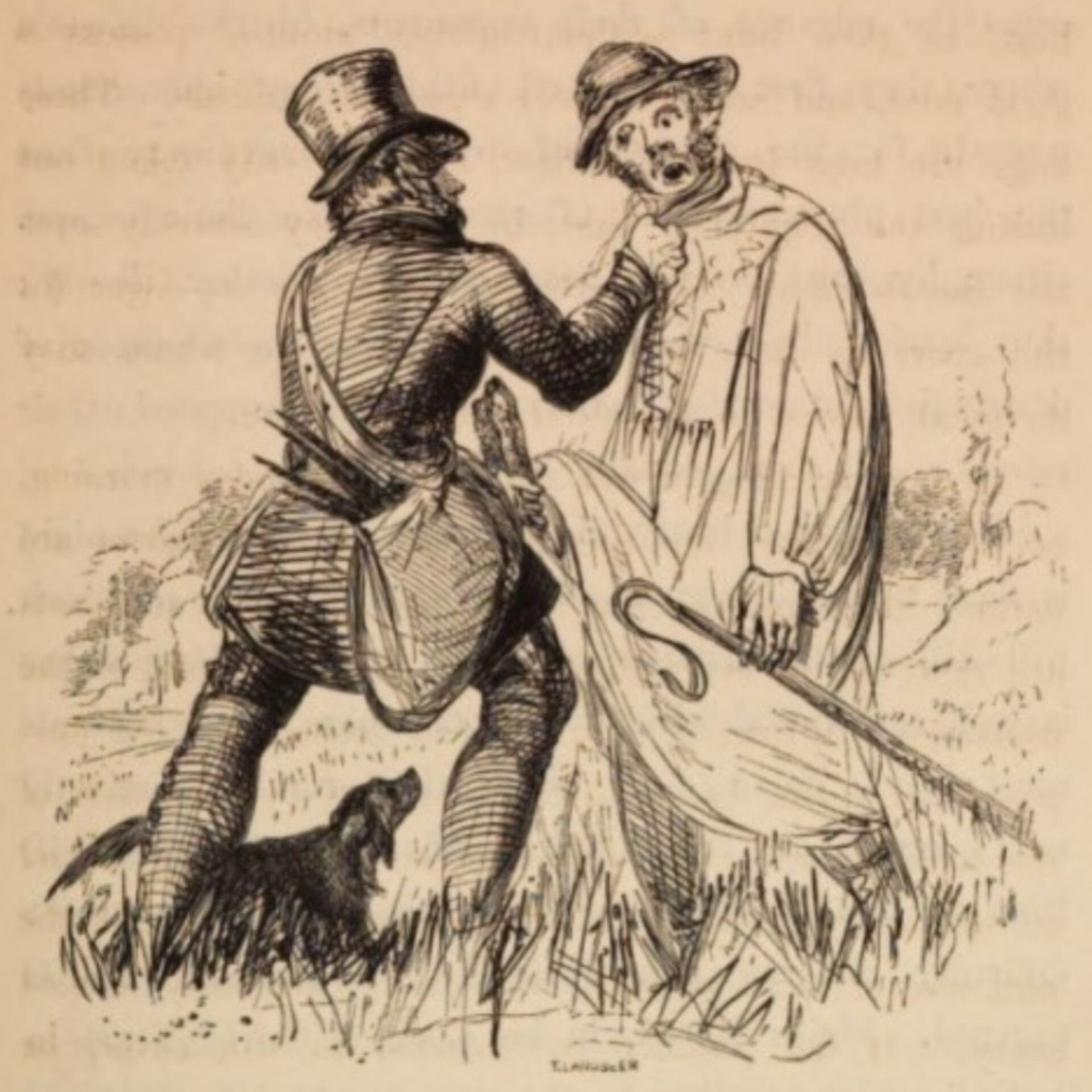If the poacher be detected in the cover, he motions his dog to leave the spot, which instantly obeys; he has nothing on him; he is not armed; and has a thousand excuses to make, — that he has lost his way, — is seeking for some stray cattle, and is probably suffered to depart; not always, however, without a search; for, even under the simple garb of the shepherd, the poacher endeavours to conceal his real character, and his booty.